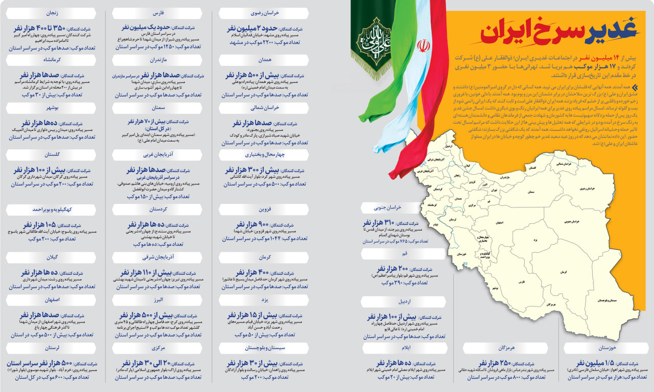 مردم امسال در عید غدیر به جای جشن و شادی، به خیابان آمدند تا غیرت‌شان را فریاد کنند و مهمانی کیلومتری غدیر تبدیل شد به اجتماع «ایران؛ ذوالفقار علی».این اطلاع‌نگاشت مروری دارد به عدد و رقم‌های تاریخی غدیر امسال، از حضور ۱۴ میلیون نفری مردم و برپایی ۱۷ هزار موکب در اجتماعات غدیر در سراسر کشور.