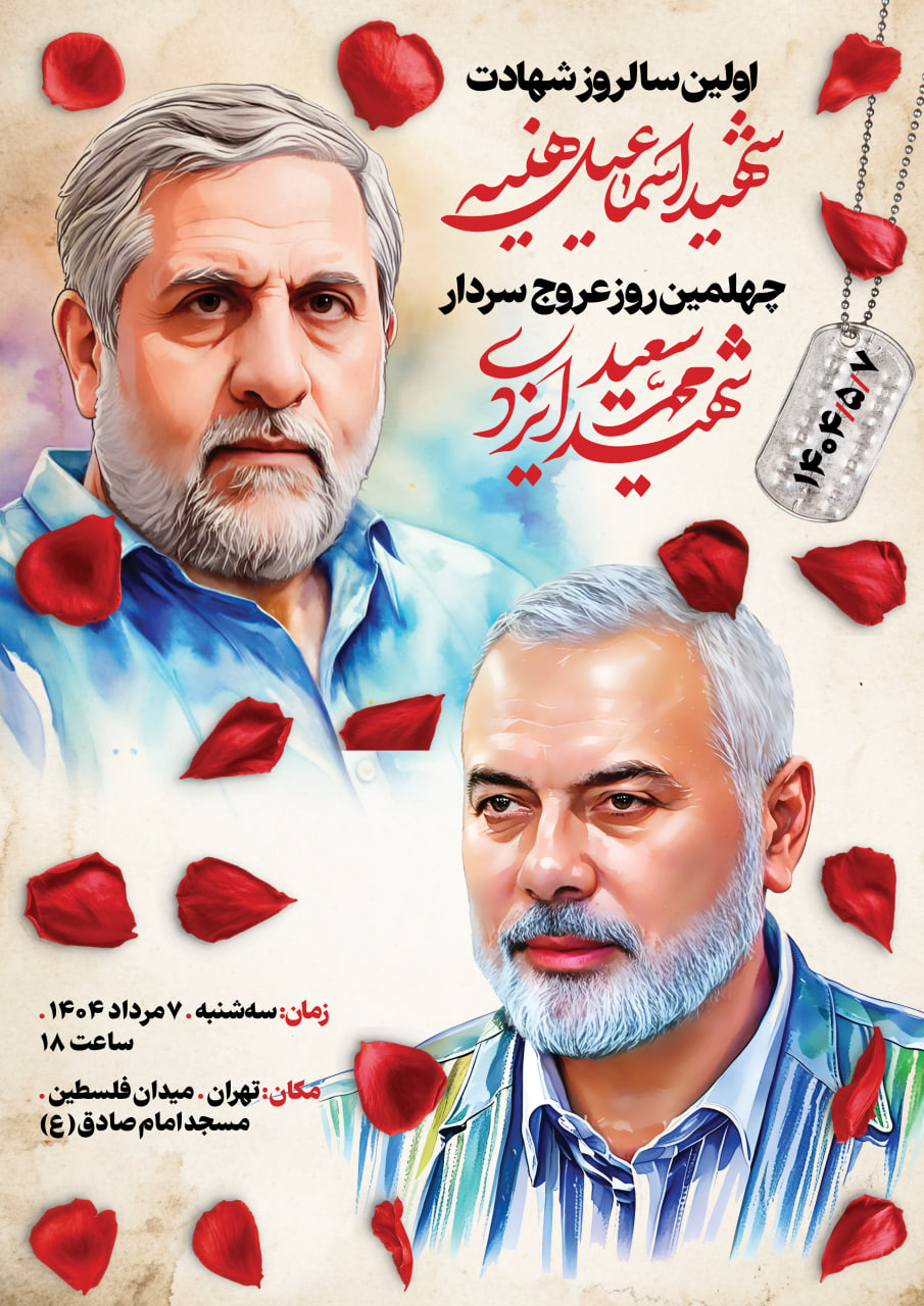 مراسم بزرگداشتی به مناسبت اولین سالگرد شهادت دکتر «اسماعیل هنیه»، رئیس دفتر سیاسی جنبش مقاومت اسلامی (حماس) و همچنین چهلمین روز شهادت سردار «محمد سعید ایزدی» (حاج رمضان)، ۷ مردادماه در مسجد امام صادق تهران برگزار می‌شود.