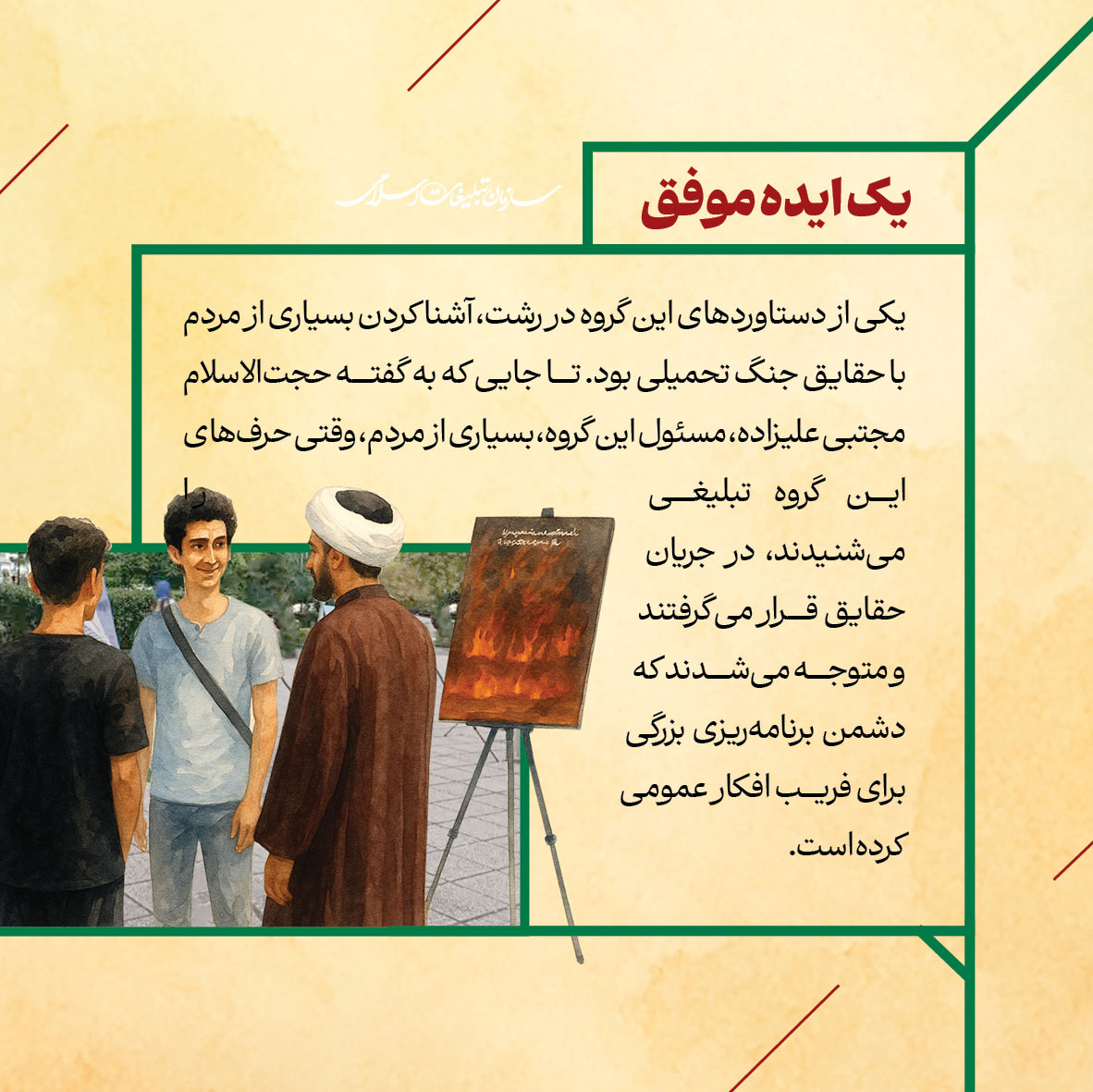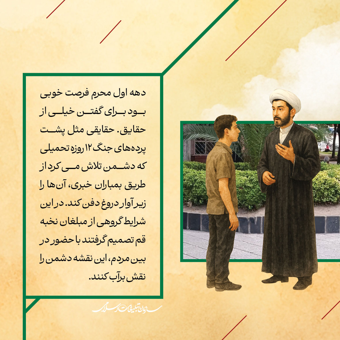 به گزارش روابط عمومی سازمان تبلیغات اسلامی، دهه اول محرم فرصت خوبی بود برای گفتن خیلی از حقایق. حقایقی از پشت پرده‌های جنگ تحمیلی اخیر که دشمن تلاش می‌کرد تا آن‌ها را از طریق بمباران خبری زیر آوار دروغ دفن کند. پس از جنگ دوازده روزه و همزمان با آغاز ایام عزاداری حضرت اباعبدالله الحسین علیه‌السلام گروهی از مبلغان نخبه قم برای گفت‌وگو با مردم و تبیین چهره به چهره راهی رشت شدند؛ این نشریه دیجیتال مروری است بر روایت تبلیغ این روحانیون جهادی.