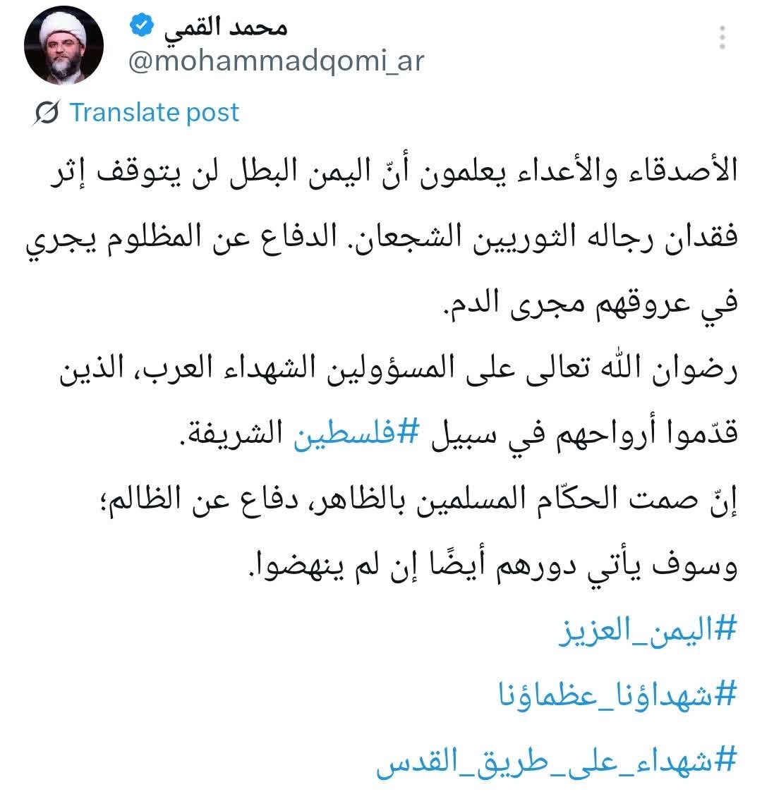 به گزارش روابط عمومی سازمان تبلیغات اسلامی، حجت‌الاسلام محمد قمی، رئیس سازمان تبلیغات اسلامی برای گرامی‌داشت یاد احمد غالب الرهوی، نخست‌وزیر مجاهد و دیگر دولتمردان شهید یمن سربلند و مقاوم در صفحه شخصی خود در شبکه اجتماعی ایکس برای مخاطبان عرب زبان نوشت؛