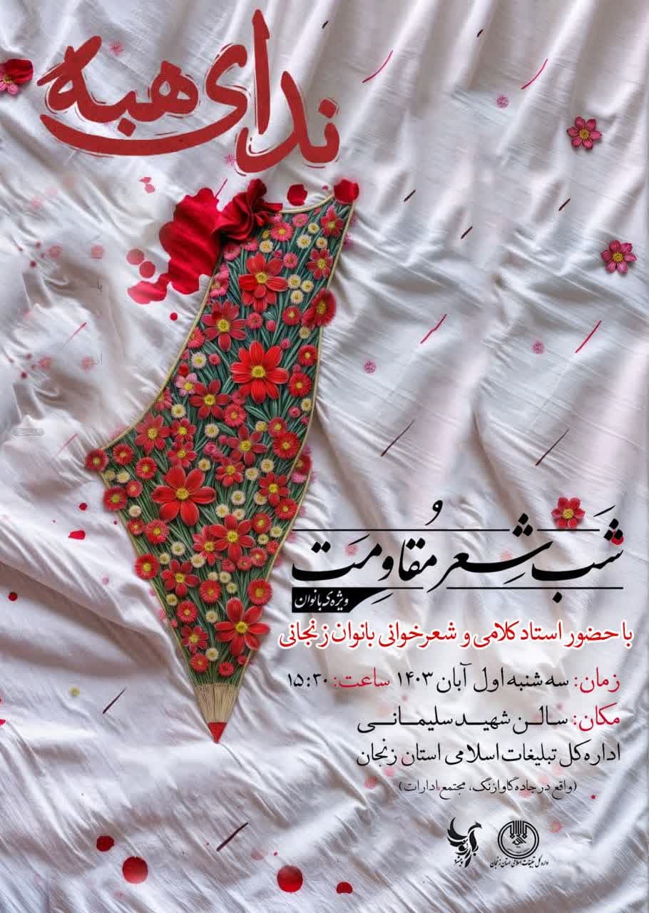 به گزارش روابط عمومی سازمان تبلیغات اسلامی، به همت امور بانوان اداره کل تبلیغات اسلامی استان زنجان در راستای ارتقای روحیه پایداری و روایت زنان الگوی مقاومت از زبان شعر ، شب شعر مقاومت ویژه بانوان زنجانی برگزار میشود .