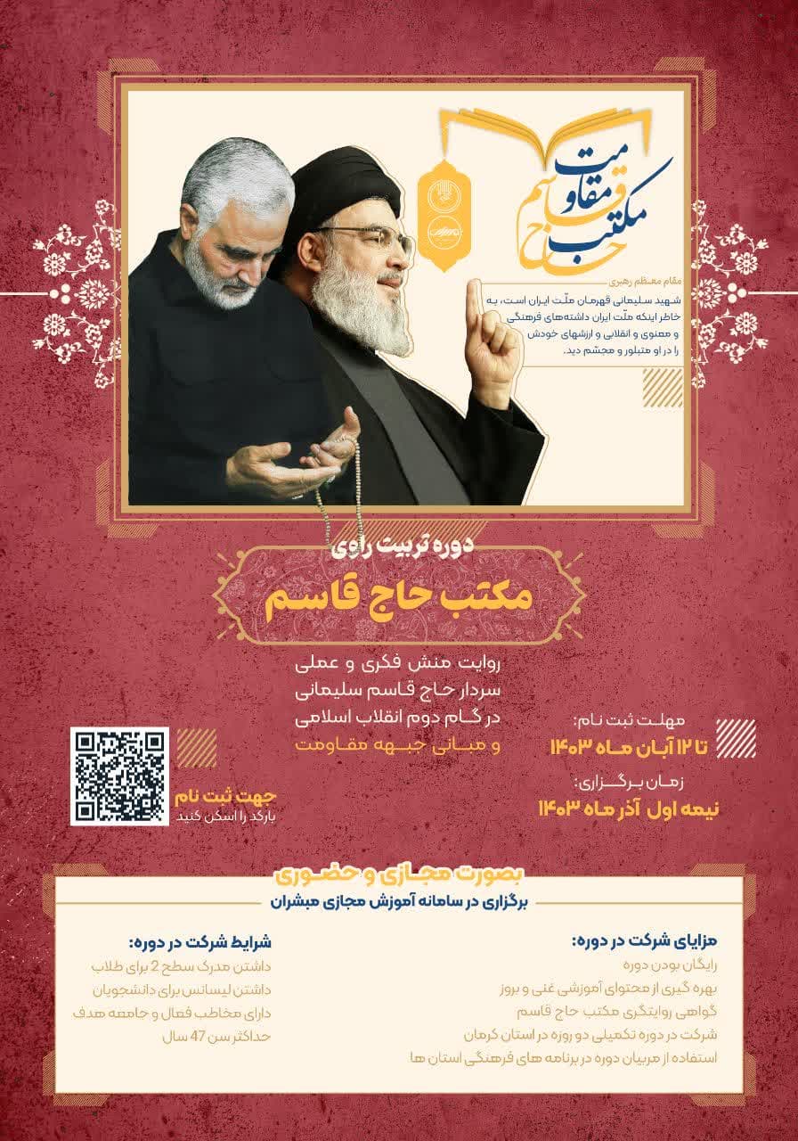 دوره تربیت راوی مکتب حاج قاسم با موضوع «روایت منش فکری و عملی سردار حاج قاسم سلیمانی در گام دوم انقلاب اسلامی» از سوی سازمان تبلیغات اسلامی برگزار میشود.