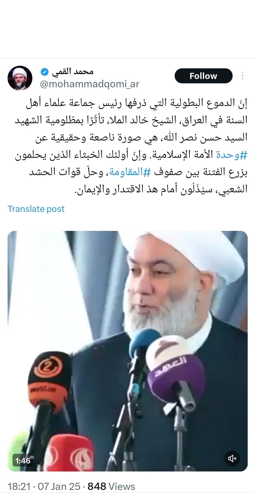 به گزارش روابط عمومی سازمان تبلیغات اسلامی، حجتالاسلام محمد قمی، رئیس سازمان تبلیغات اسلامی در واکنش به ابراز احساسات شیخ خالد الملا رئیس جماعت علمای اهل سنت عراق نسبت به دبیرکل شهید حزب الله لبنان سید حسن نصرالله (ره) در صفحه شخصی خود در شبکه ایکس نوشت: