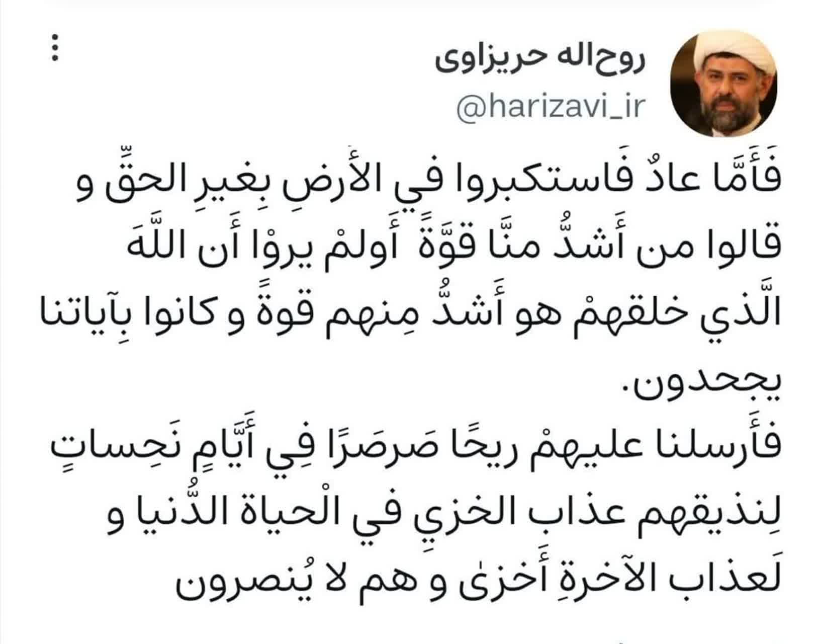 به گزارش روابط عمومی سازمان تبلیغات اسلامی، حجت الاسلام حریزاوی، قائم مقام سازمان تبلیغات اسلامی در واکنش به اتفاقات اخیر آمریکا آیاتی از قرآن را در صفحه شخصی خود در شبکه ویراستی منتشر کرد.