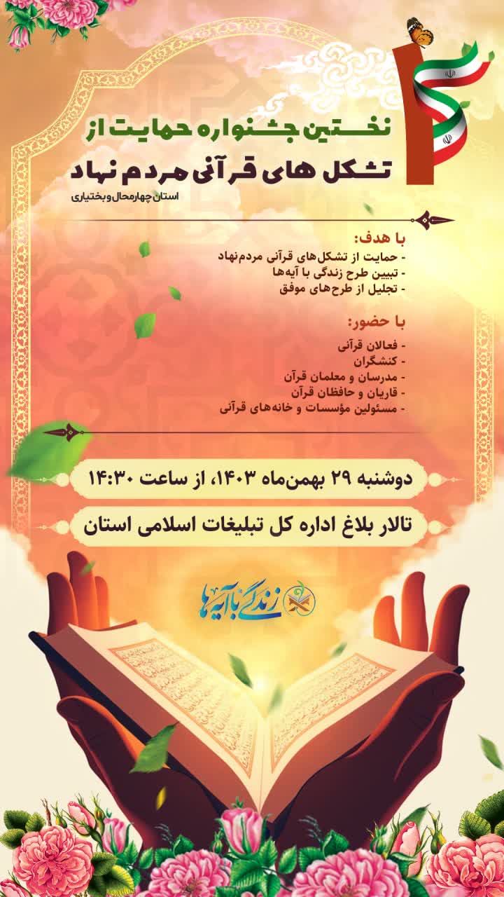 اختتامیه نخستین جشنواره حمایت از تشکلهای قرآنی مردم نهاد استان چهارمحال و بختیاری ۲۹ بهمنماه در سالن بلاغ اداره کل تبلیغات اسلامی چهارمحال و بختیاری برگزار میشود.