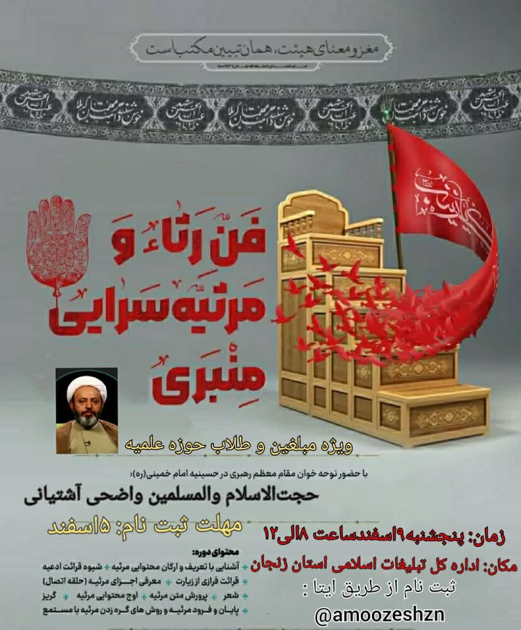 دوره آموزشی فن رثاء و مرثیه سرایی «ویژه برادران» با حضور حجتالاسلام والمسلمین شیخ جعفر واضحی آشتیانی برگزار خواهد شد.