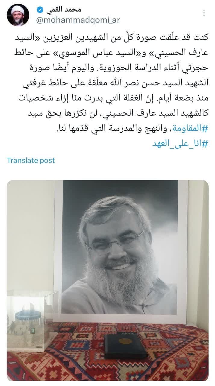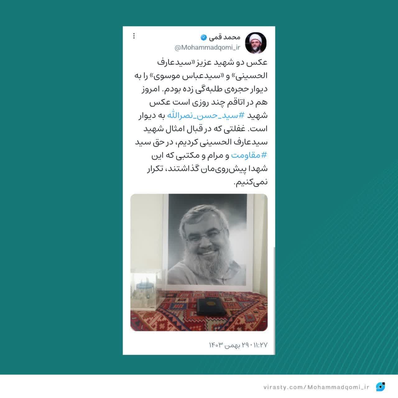 به گزارش روابط عمومی سازمان تبلیغات اسلامی، حجتالاسلام محمد قمی ، رئیس سازمان تبلیغات اسلامی در صفحه شخصی خود در شبکه اجتماعی ویراستی با انتشار تصویری از قاب عکس شهید سید حسن نصرالله که بر دیوار اتاق خود زده است بر عدم غفلت از مرام و مکتب شهدا به خصوص سید شهدای مقاومت، تأکید کرد.