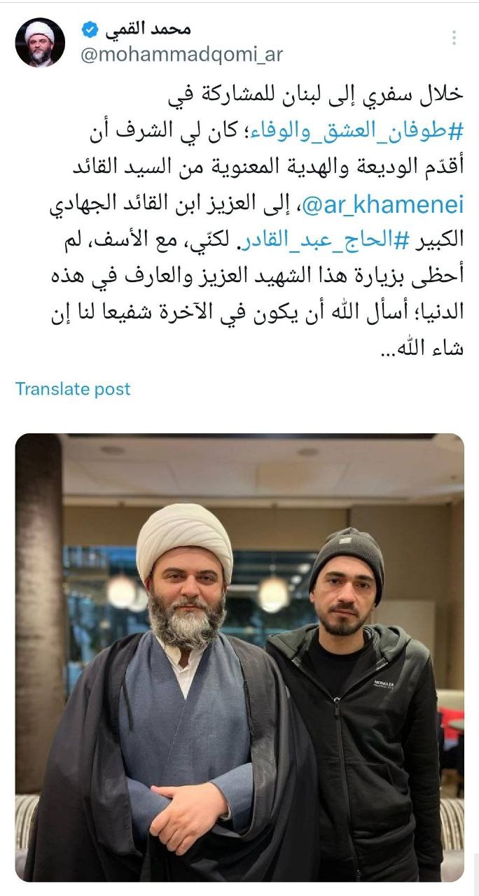 در جریان سفرم به لبنان برای شرکت در طوفان عشق و وفاداری؛ این افتخار را داشتم که امانت و هدیه معنوی را از طرف رهبر انقلاب، به فرزند عزیز شهید ابراهیم عقیل تقدیم کنم. اما متاسفانه، من مفتخر به دیدار این شهید عزیز و عارف در این دنیا نشدم. از خدا میخواهم که او در آخرت شفیع ما باشد، ان شاء الله…