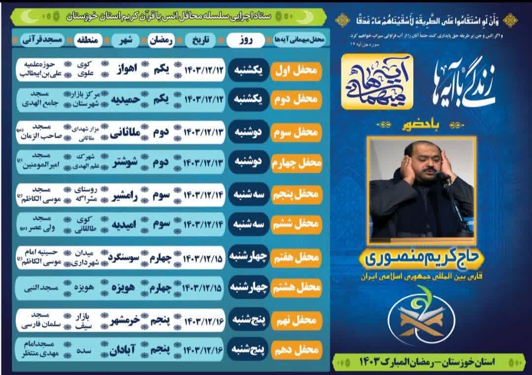 ویژه برنامه مهمانی آیه ها به همت دارالقرآن الکریم خوزستان برگزار می شود.