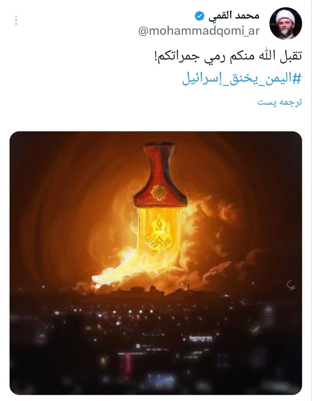 رئیس سازمان تبلیغات اسلامی پس از حمله موفق موشکهای یمنی به فرودگاه بن گوریون در شهر تلآویو در سرزمین های اشغالی برای مخاطبان عرب زبان خود در شبکه اجتماعی ایکس نوشت؛ تقبل الله منكم رمي الجمرات.