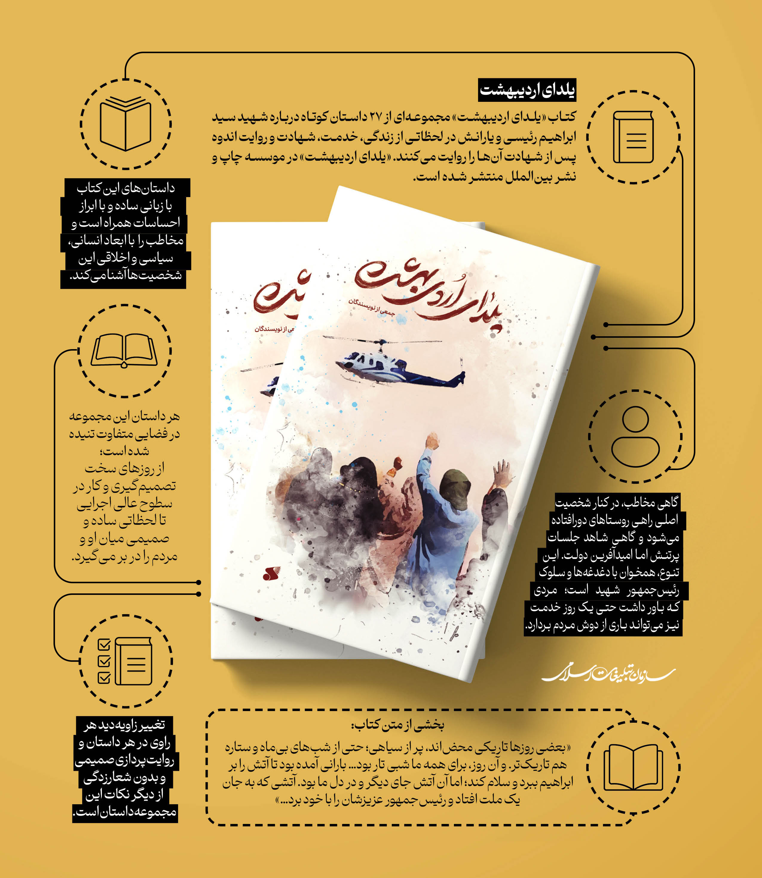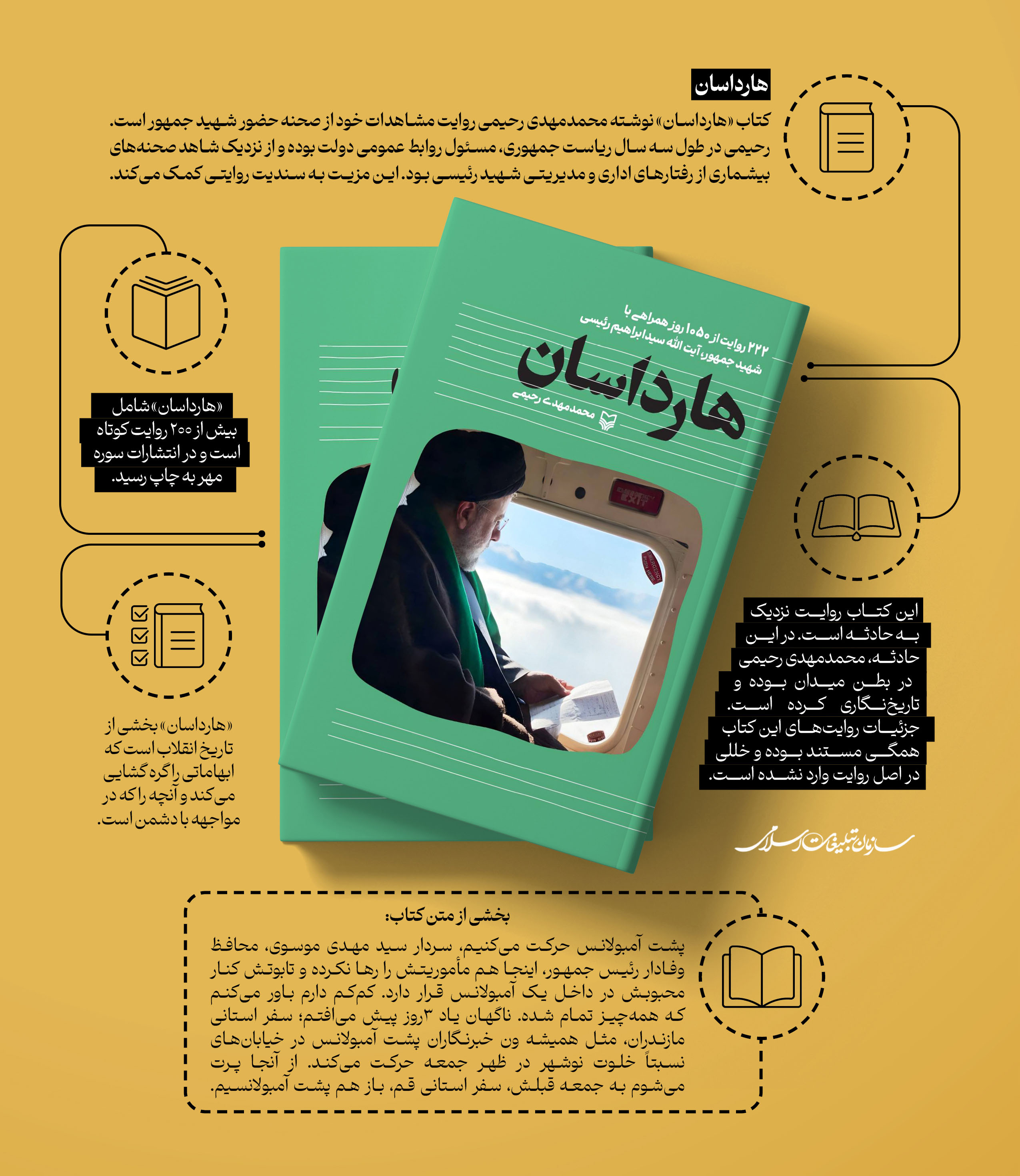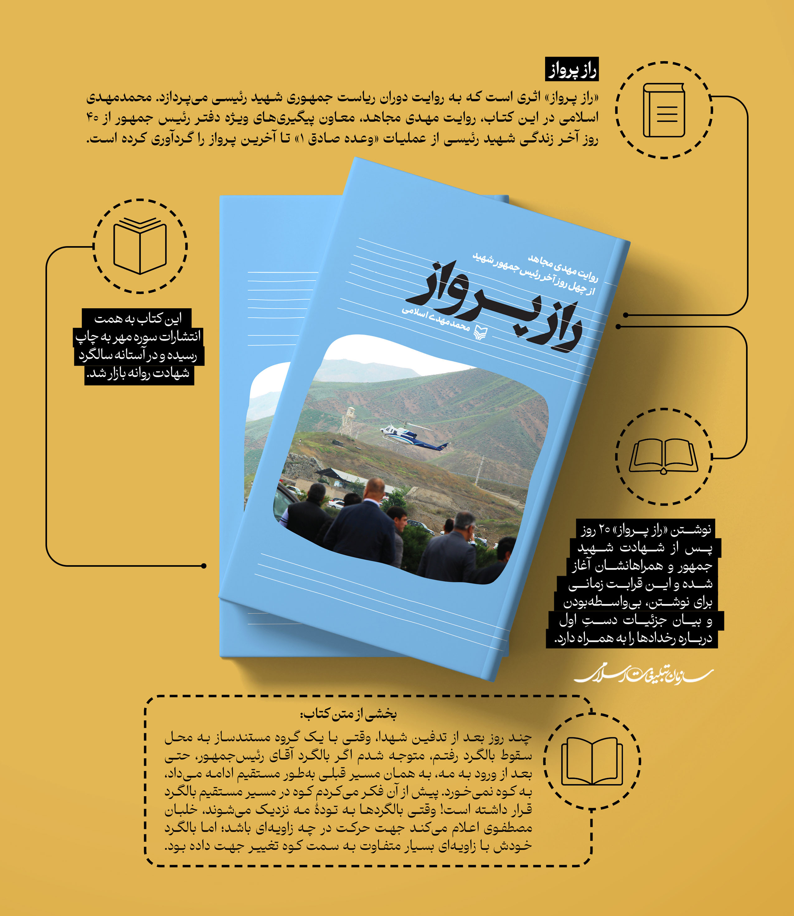 از آنچه در آن سه سال گذشت، تا روایتهایی از چهل روز آخر خدمت و بیستوهفت قصه قبل از آن شب غمانگیز پرواز اردیبهشت را بخوانید. «هارداسان» به قلم محمدمهدی رحیمی در انتشارات سوره مهر، «راز پرواز» به قلم محمدمهدی اسلامی در انتشارات سوره مهر و «یلدای اردیبهشت» در انتشارات بینالملل به یاد شهید سید ابراهیم رئیسی به چاپ رسیده و روانهی بازار نشر شدهاند. این اطلاع نگاشت را ببینید.