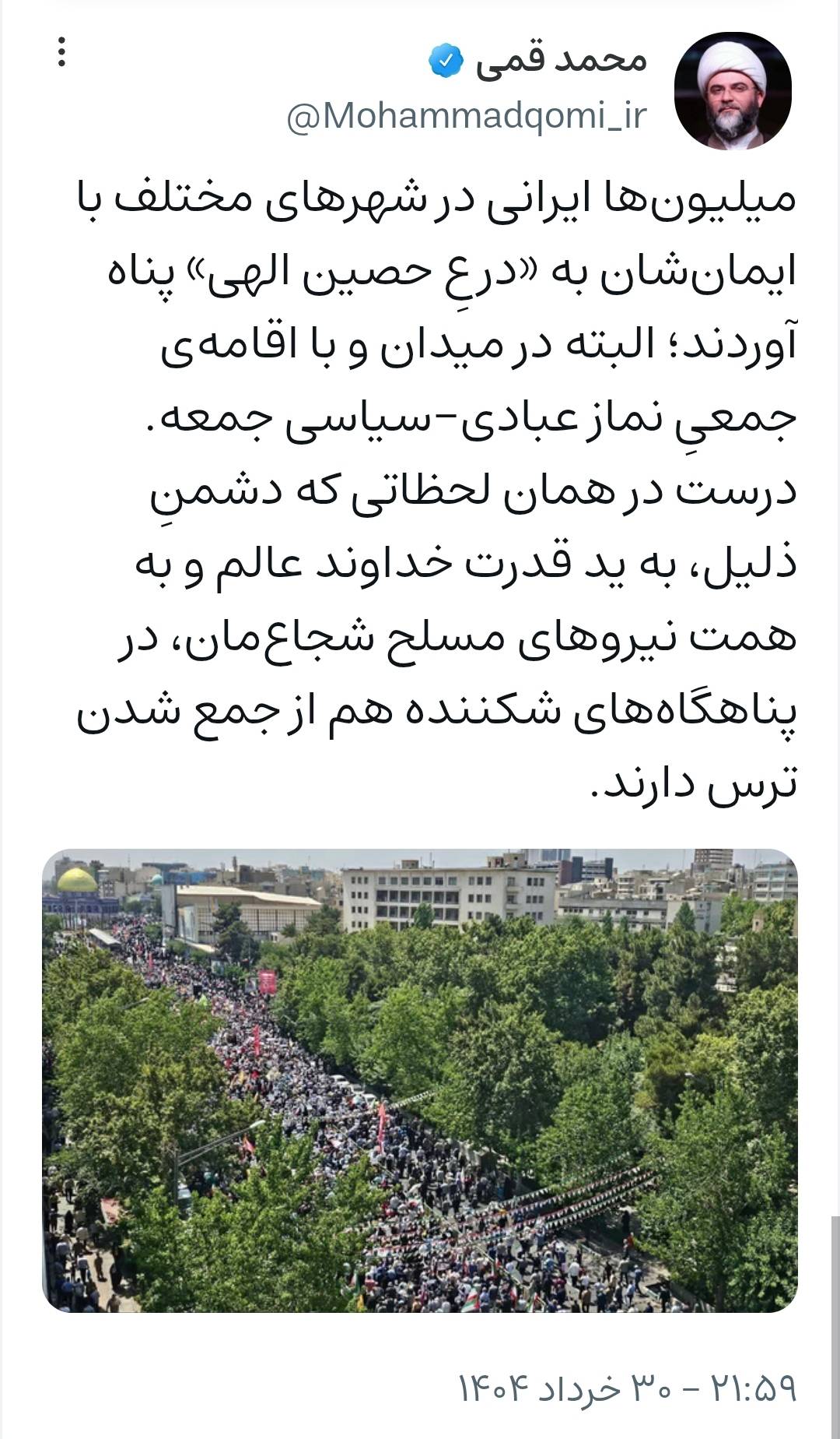 میلیونها ایرانی در شهرهای مختلف با ایمانشان به «درعِ حصین الهی» پناه آوردند؛ البته در میدان و با اقامهی جمعیِ نماز عبادی-سیاسی جمعه. درست در همان لحظاتی که دشمنِ ذلیل، به ید قدرت خداوند عالم و به همت نیروهای مسلح شجاعمان، در پناهگاههای شکننده هم از جمع شدن ترس دارند.