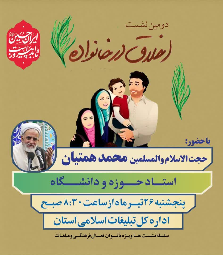 دومین نشست اخلاق در خانواده با حضور حجتالاسلام و المسلمین همتیان ویژه جمعی از بانوان استان چهارمحال و بختیاری امروز، ۲۶ تیرماه در اداره کل تبلیغات اسلامی استان برگزار شد.