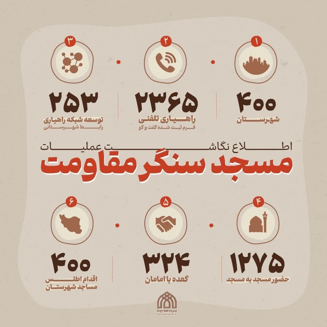عملیات «مسجد، سنگر مقاومت» با هدف تقویت ارتباط امامان محله و مساجد با مردم در ۴۰۰ شهرستان اجرا شد تا بیش از ۲هزار و ۳۰۰ مسجد در سراسر کشور محلی برای روایت مقاومت و سنگری برای حضور مردم در شرایط جنگی شوند.