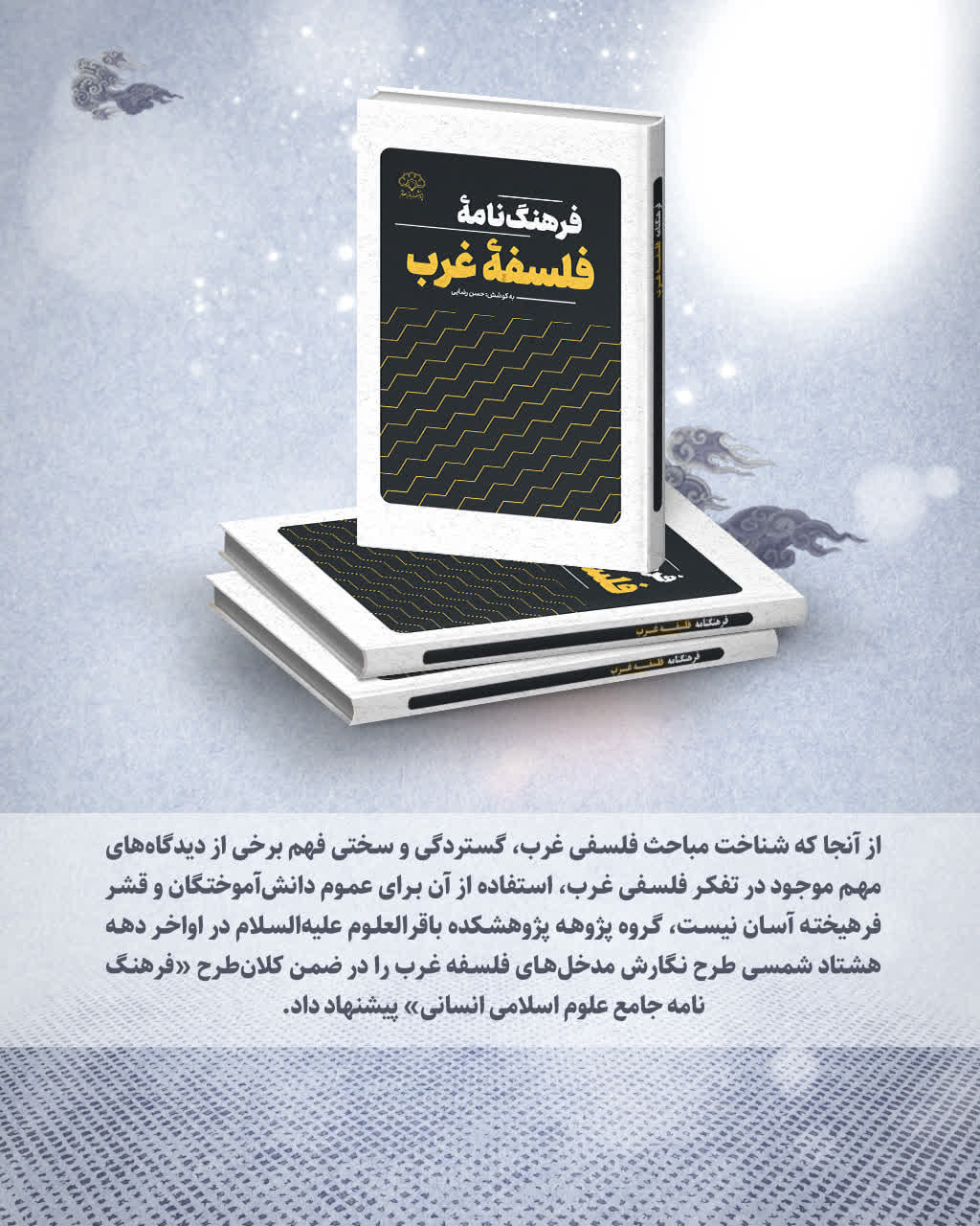 کتاب «فرهنگنامه فلسفه غرب»، به کوشش حسن رضایی، در قطع وزیری، با ۶۷۲ صفحه و شمارگان ۱۰۰۰ نسخه، اخیراً توسط انتشارات پژوهشکده باقرالعلوم (ع) منتشر شده است.