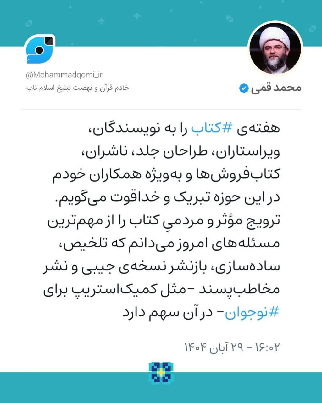 ۲۹ آبان | حجتالاسلام قمی به مناسبت هفته کتاب نوشت؛