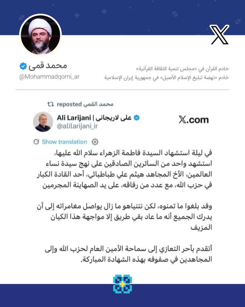 حجتالاسلام محمد قمی، رئیس سازمان تبلیغات اسلامی در پی ترور و شهادت فرمانده ارشد و مجاهد حزبالله پیروز، شهید هیثم علی طباطبایی در شب شهادت حضرت صدیقه طاهره (س)، توئیت عربی دکتر علی لاریجانی دبیر شورای عالی امنیت ملی را بازنشر کردند.