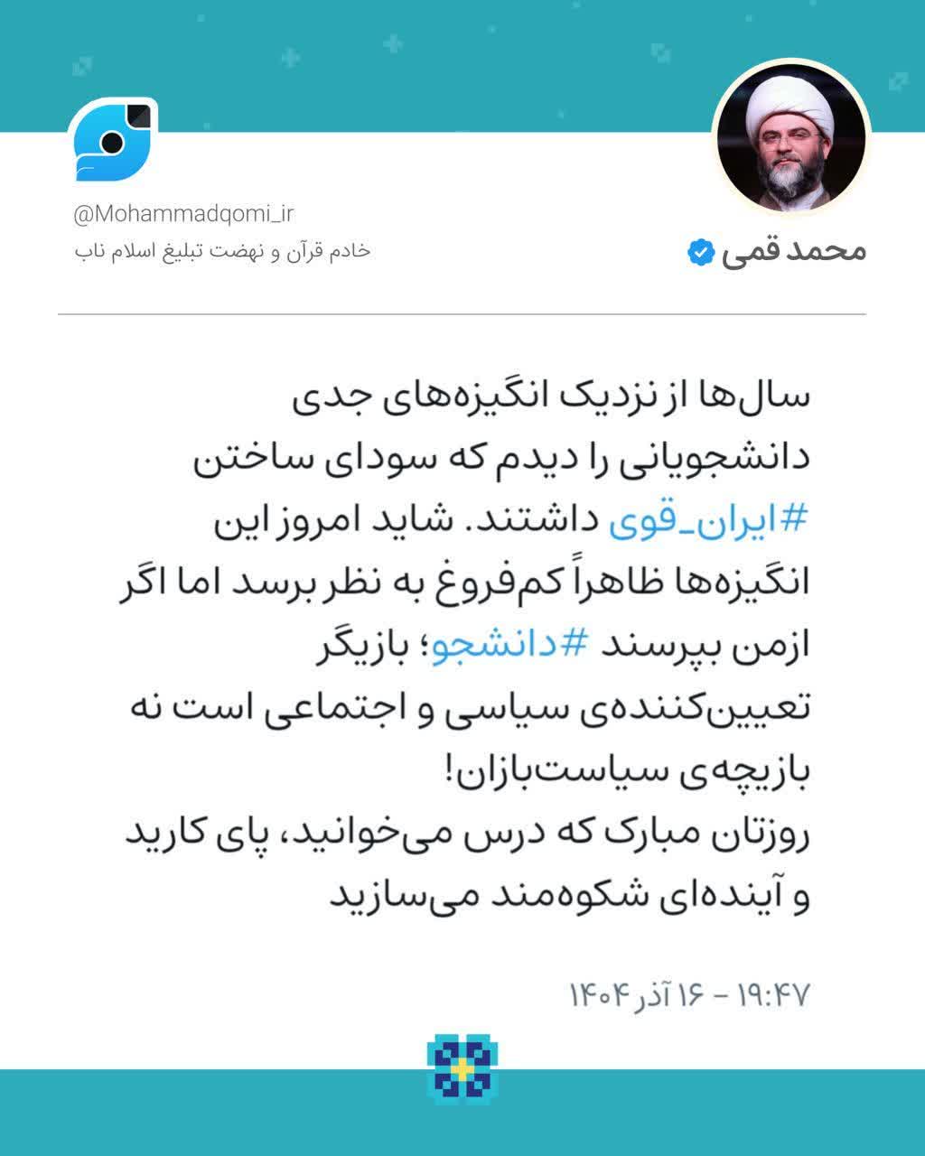 حجت الاسلام محمد قمی در این پیام تبریک نوشت؛ سالها از نزدیک انگیزههای جدی دانشجویانی را دیدم که سودای ساختن ایران قوی داشتند. شاید امروز این انگیزهها ظاهرا کم فروغ به نظر برسد اما اگر از من بپرسند، دانشجو بازیگر تعیینکننده سیاسی و اجتماعی است نه بازیچه سیاستبازان!